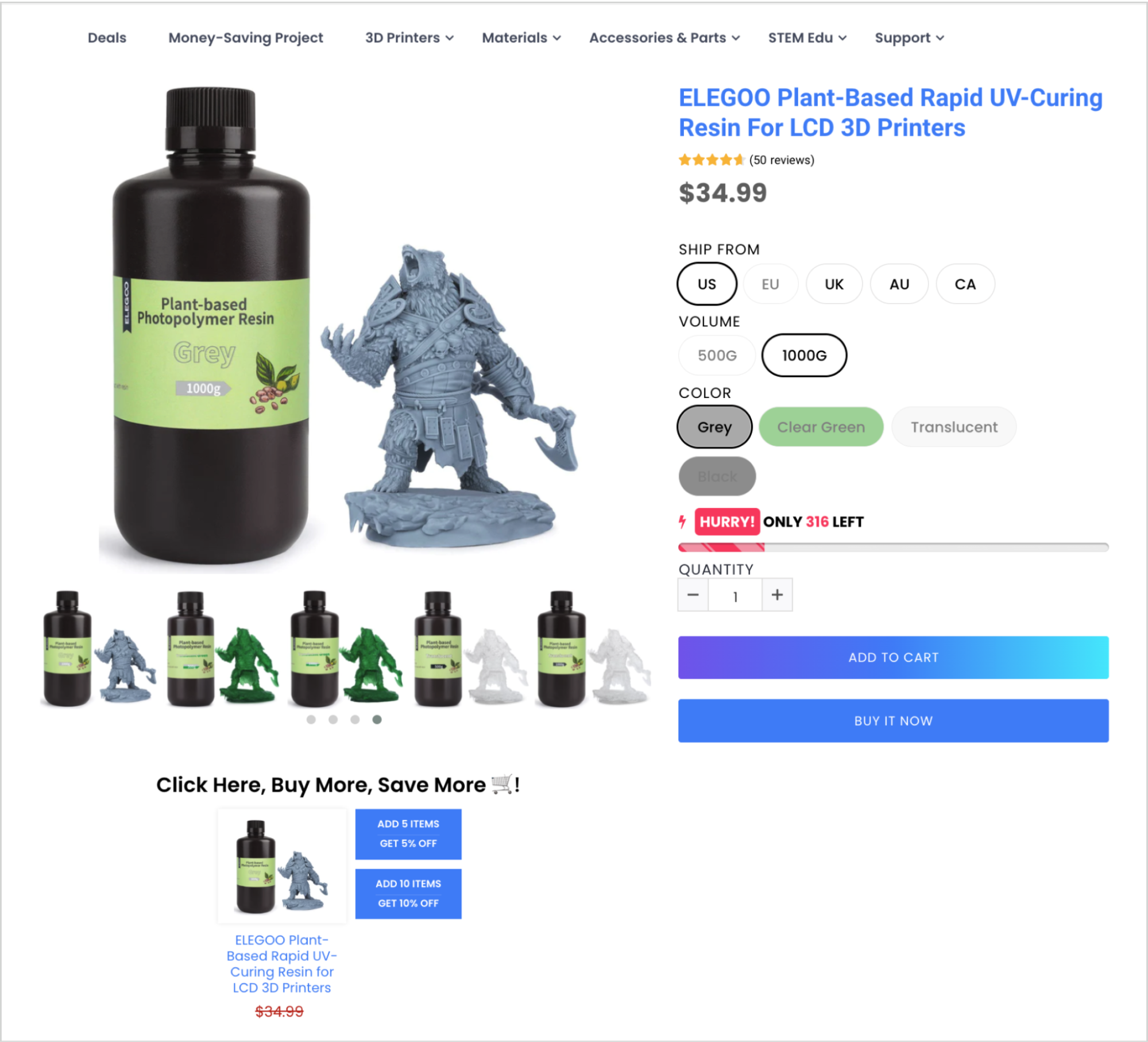 For example, a countdown timer for a limited-time offer compels immediate action, while free shipping thresholds encourage customers to add more items to their cart to qualify. Strategically deploying these conversion tools boosts revenue growth and enriches the checkout experience, making it more engaging and rewarding for customers. We’ve also seen brands like Elegoo do this to bundle items that have been frequently bought together.