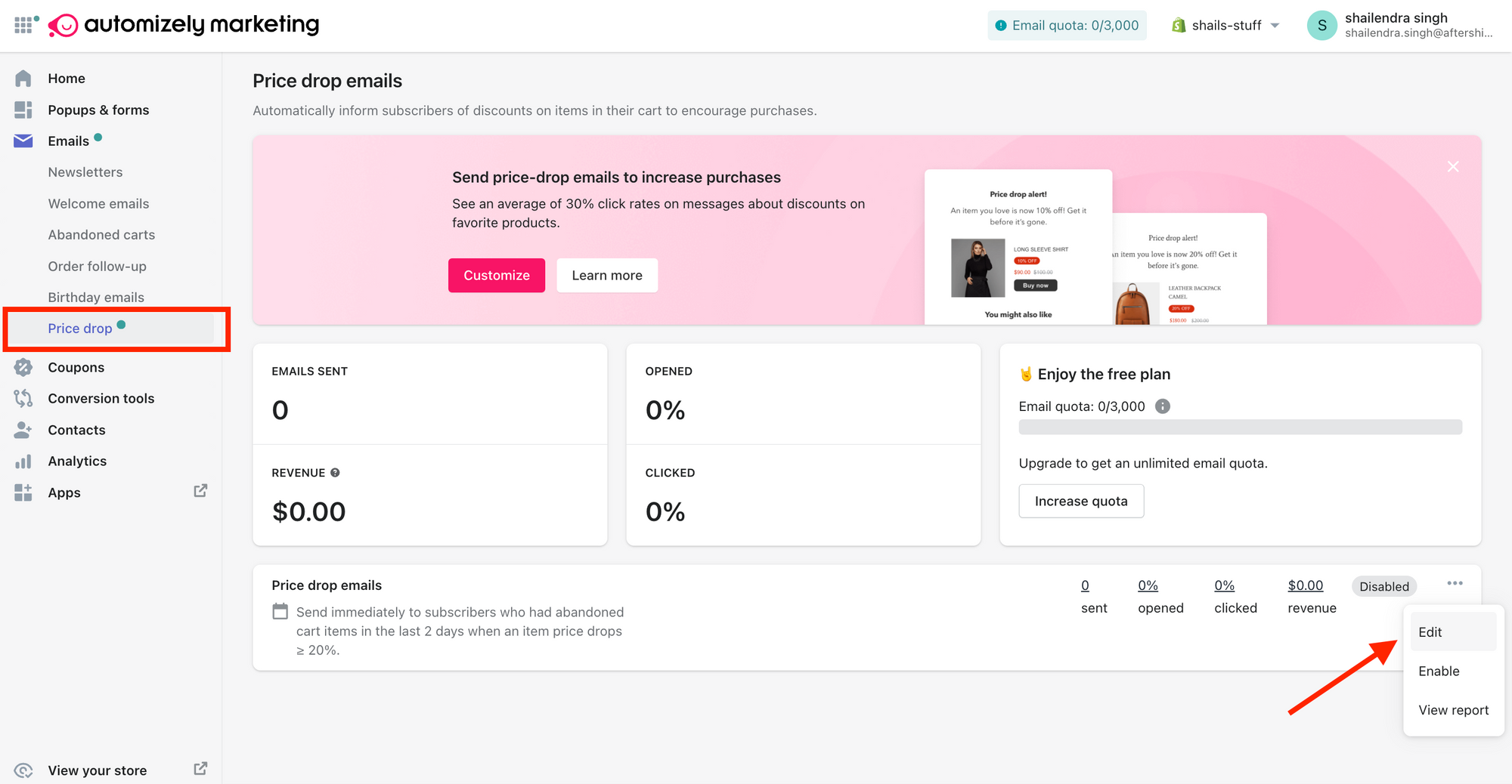 - Select the “Price drop emails” under the “Emails” tab