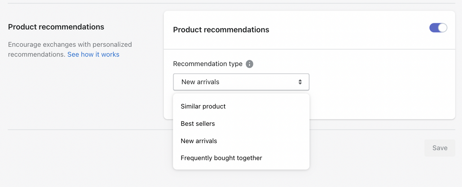 - Choose the algorithm that the platform will use to provide exchange recommendations. Available options are similar products, best sellers, new arrivals, and frequently bought together.