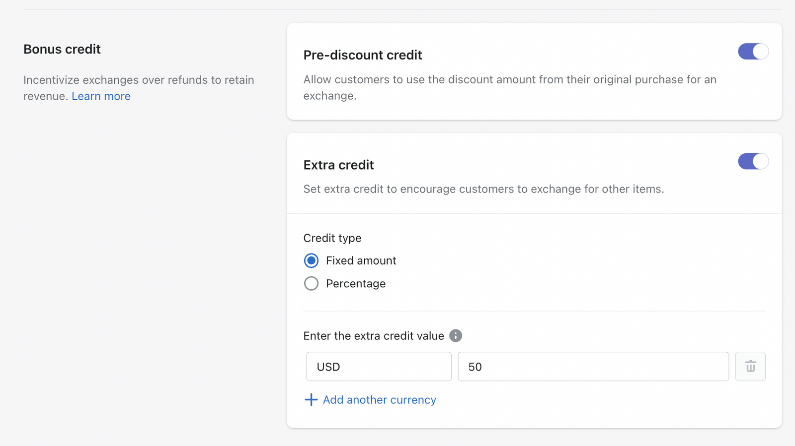 Incentivizing exchanges over refunds, like additional free shipping or a pre-discount credit, will increase the likelihood of an exchange. For instance, in AfterShip Returns you can enable pre-discount credit that applies the discount amount of the original purchase to the exchange item. (If a BFCM buyer was initially motivated by a deep discount, this is a powerful reminder that it's still available to them if they choose an exchange.)
