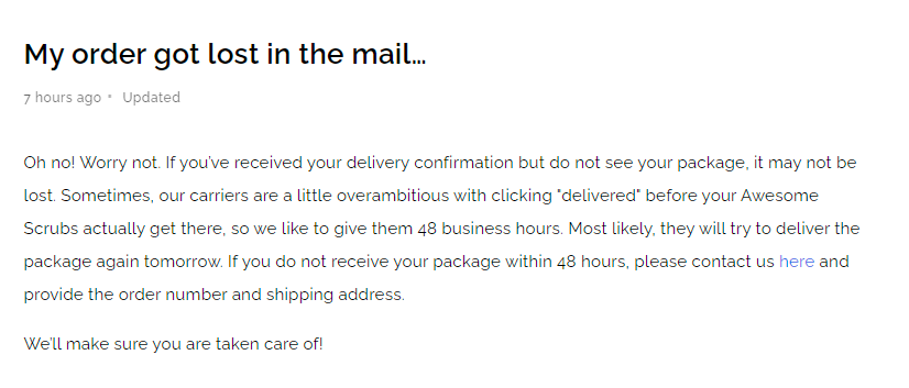 If your business isn’t equipped with a tracking tool, a simple solution is to put your customer service details on an FAQ page, or in another easy-to-find location. This gives the process structure and empowers your customers toward self-service. Reiterating your EDDs and exceptions (as above) will also help to soothe anxieties and cut down on WISMO messages and, consequently, the time spent by your support team addressing customer inquiries.