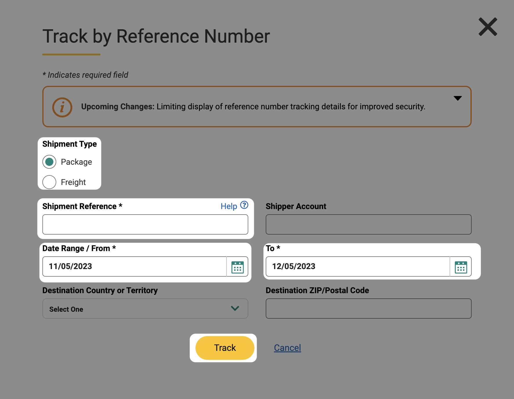 Zde byste si měli vybrat typ zásilky, zadat referenční číslo zásilky a časové období, abyste získali informace o zásilce.