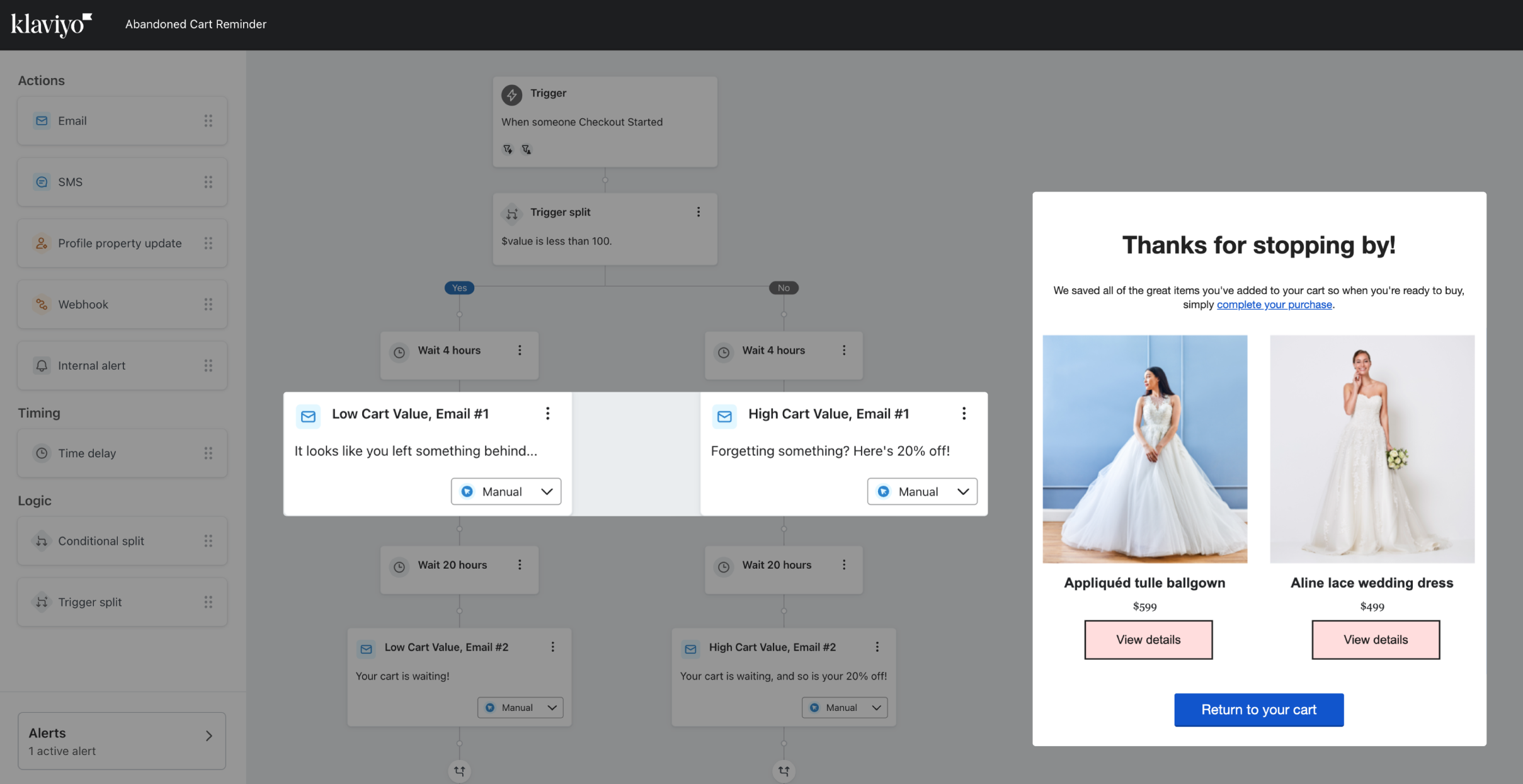 Initiate follow-up emails to remind shoppers about their abandoned carts or incomplete checkouts. Motivate shoppers to complete their purchases, boosting the average order value (AOV).