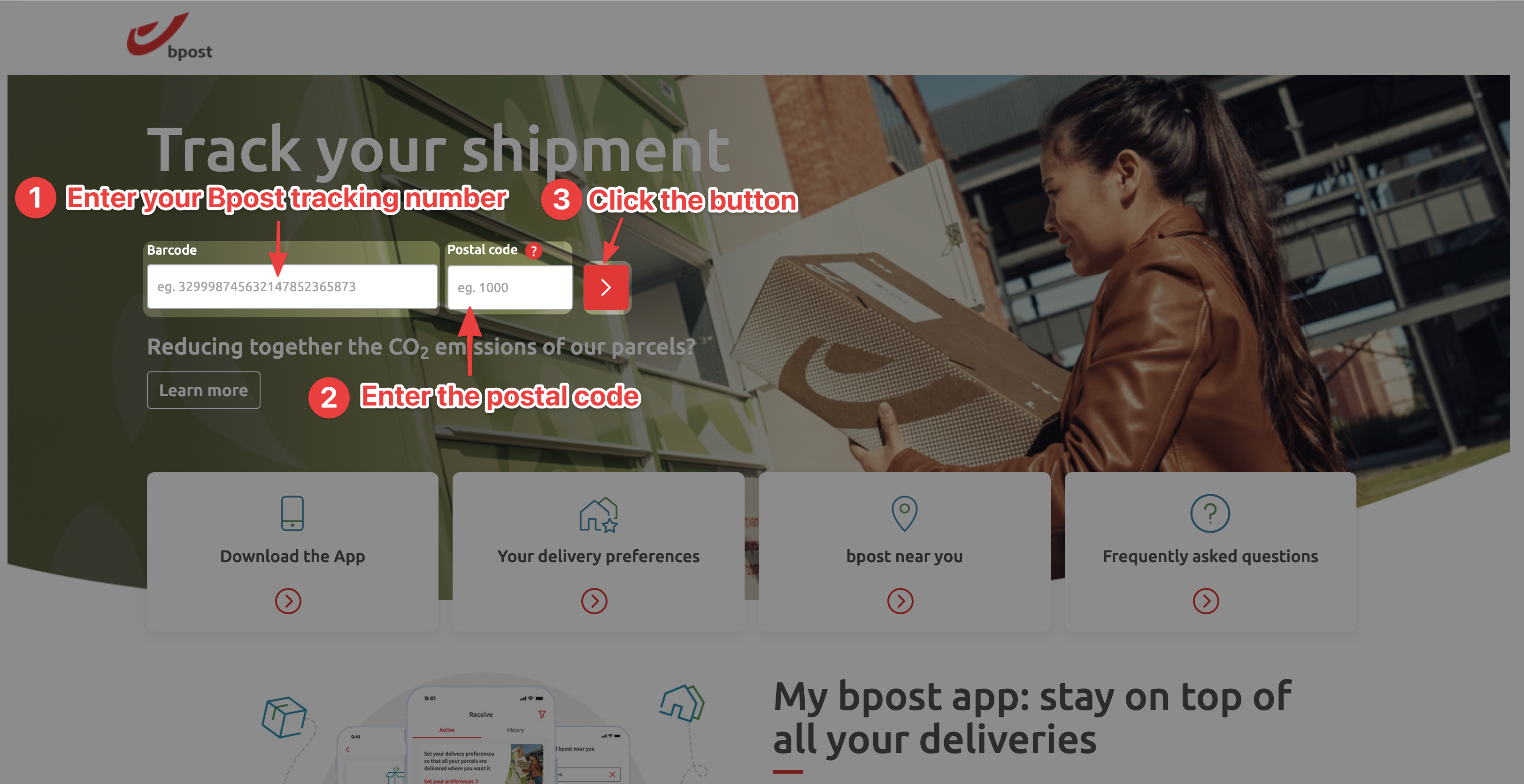 Enter your tracking number: On the tracking page, enter your bpost package tracking number and click the "Track" button.