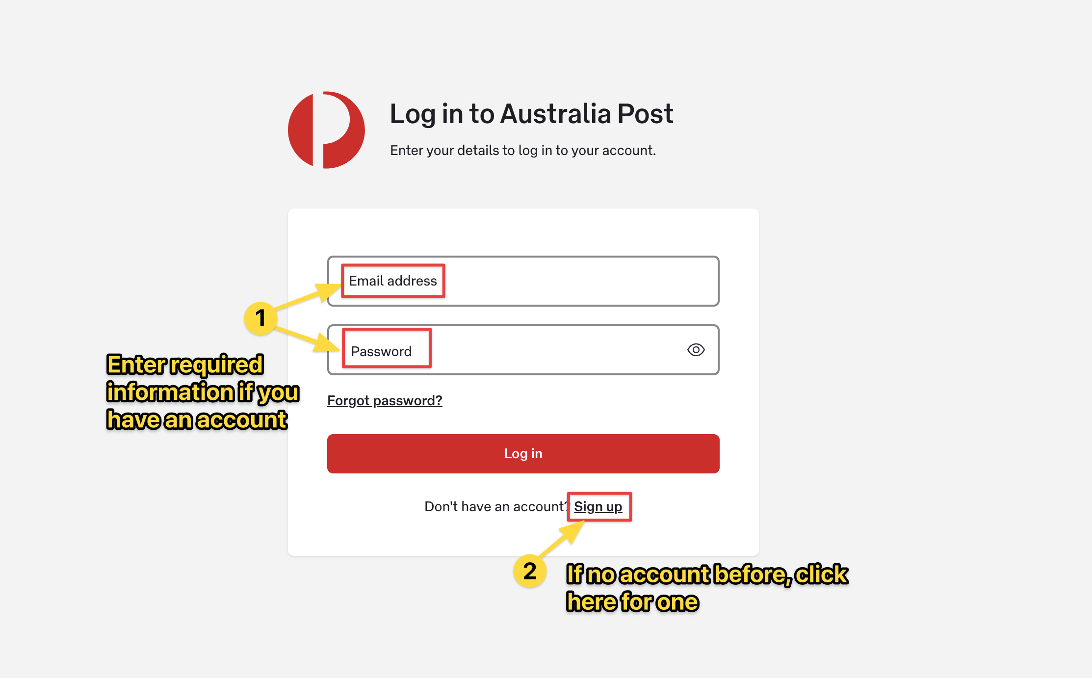 - 设置 MyPost 帐户: 如果您还没有帐户,只需单击澳大利亚邮政网站上的“注册”链接即可。按照提示使用您的电子邮件地址和您选择的安全密码创建帐户。