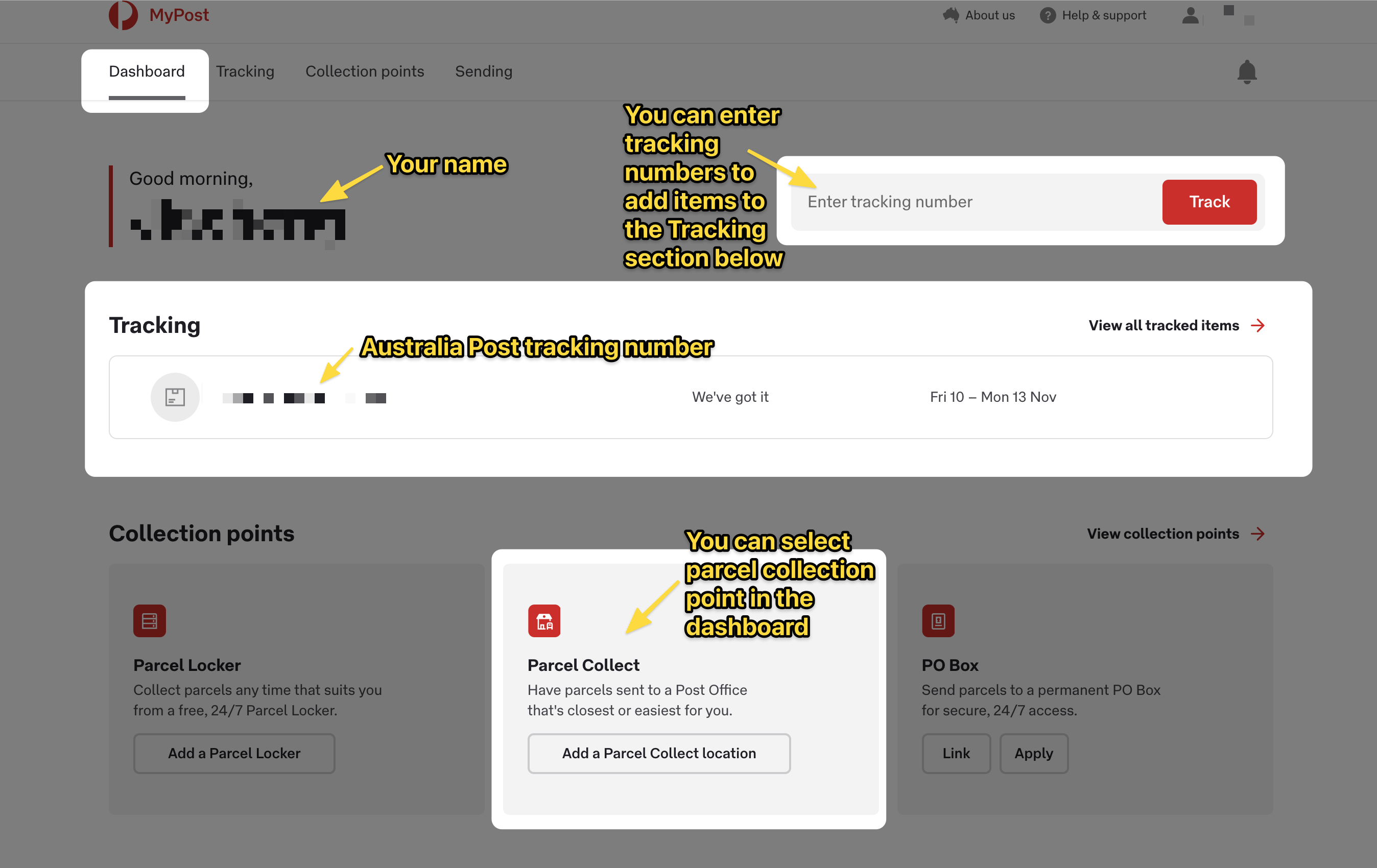 - 到达您的仪表板: 仪表板充当您的大本营,可让您快速访问与澳大利亚邮政活动相关的基本任务和信息。这个一站式中心为您提供了方便的选择来轻松管理您的包裹。从这个中心位置,您可以轻松跟踪您的包裹,直接通过澳大利亚邮政进行在线查询,甚至根据需要选择其他送货地址。